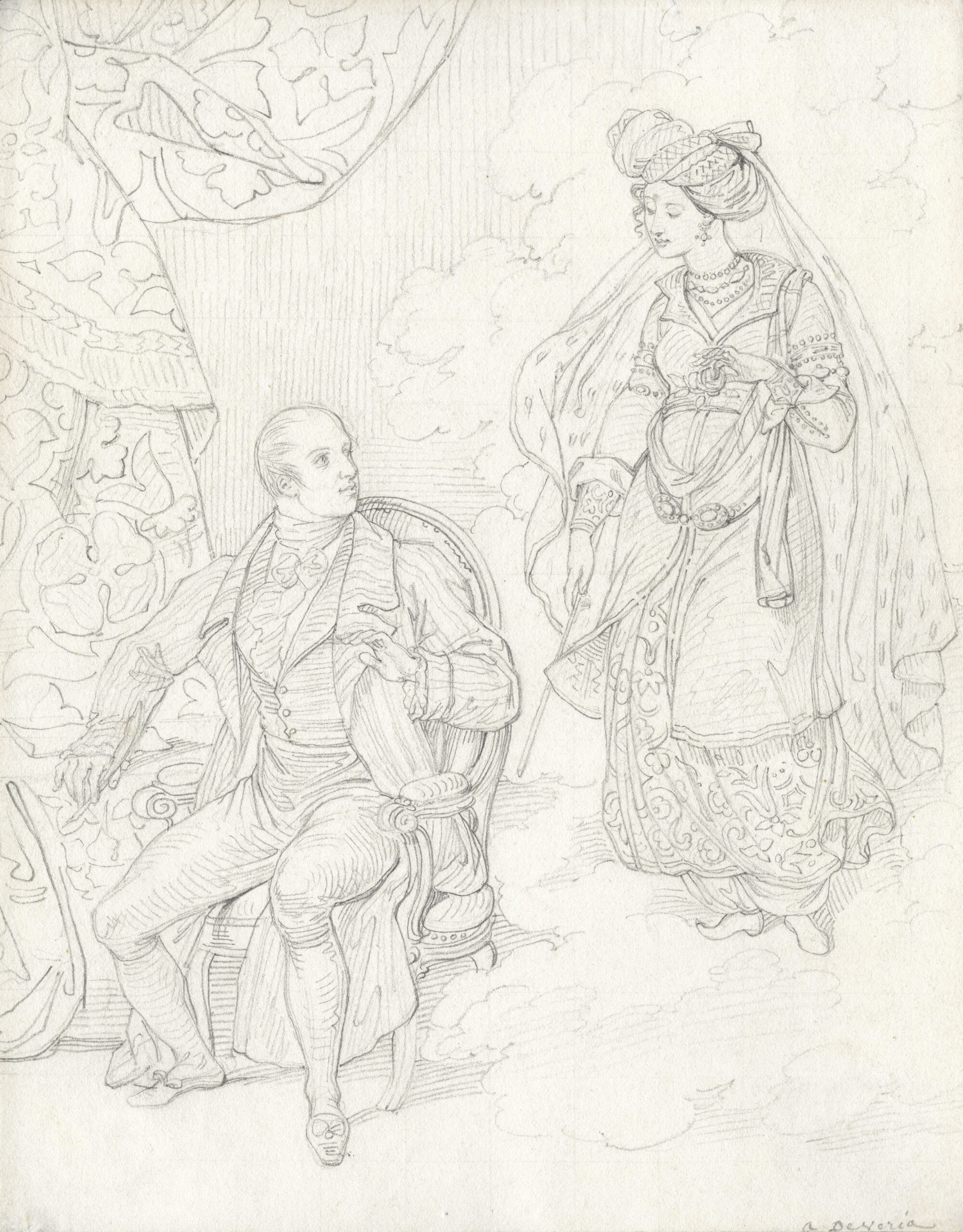 Béranger et la fée, vers 1825Crayon sur papier21,2 × 16,7 cmAnnoté en bas à droite a. DeveriaProvenance : collection Pierre et Franca Belfond (éditions Belfond) « Amis, hier, j’étais faible et morose, l’aimable fée […]